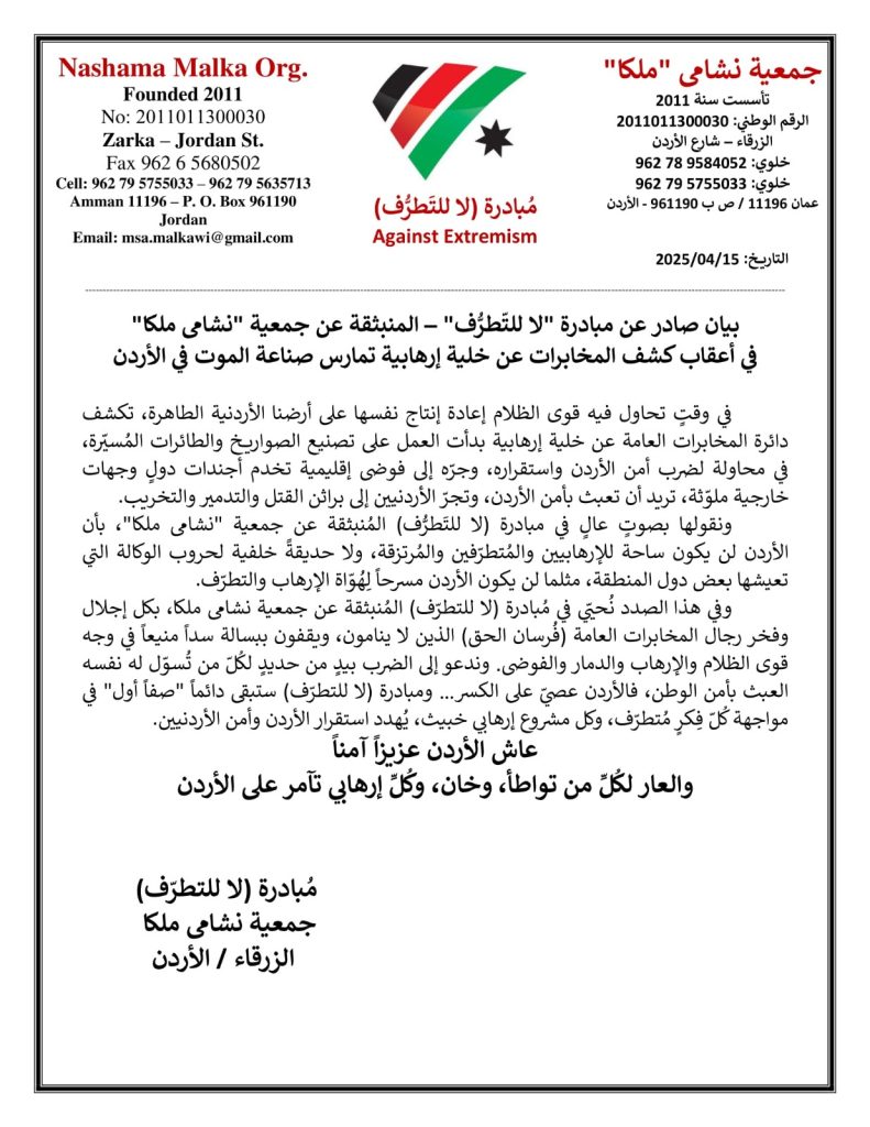 إننا في مبادرة (لا للتطرف) – المنبثقة عن جمعية نشامى ملكا – نؤكد رفضنا التام واستنكارنا الشديد لكل من تسوّل له نفسه المساس بأمن الأردن واستقراره، كما نؤكد على دعمنا الكامل للأجهزة الأمنية، وعلى رأسها دائرة المخابرات العامة، في جهودها البطولية لمواجهة المتطرفين والإرهابيين والمتآمرين، وكل خلية وفئة تحاول جر الأردن ليكون بؤرة للحروب بالوكالة.