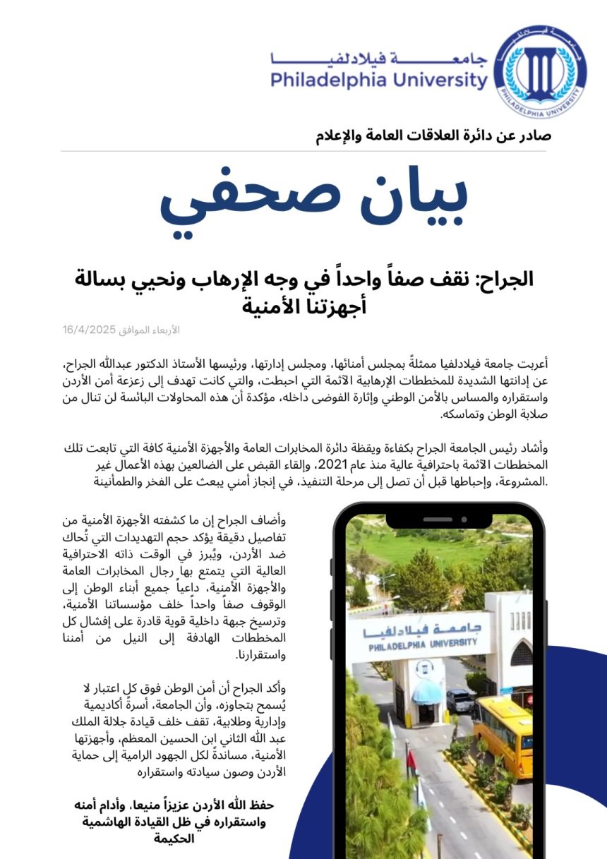 أعربت جامعة فيلادلفيا ممثلةً بمجلس أمنائها، ومجلس إدارتها، ورئيسها الأستاذ الدكتور عبدالله الجراح، عن إدانتها الشديدة للمخططات الإرهابية الآثمة التي احبطت، والتي كانت تهدف إلى زعزعة أمن الأردن واستقراره والمساس بالأمن الوطني وإثارة الفوضى داخله، مؤكدة أن هذه المحاولات البائسة لن تنال من صلابة الوطن وتماسكه.