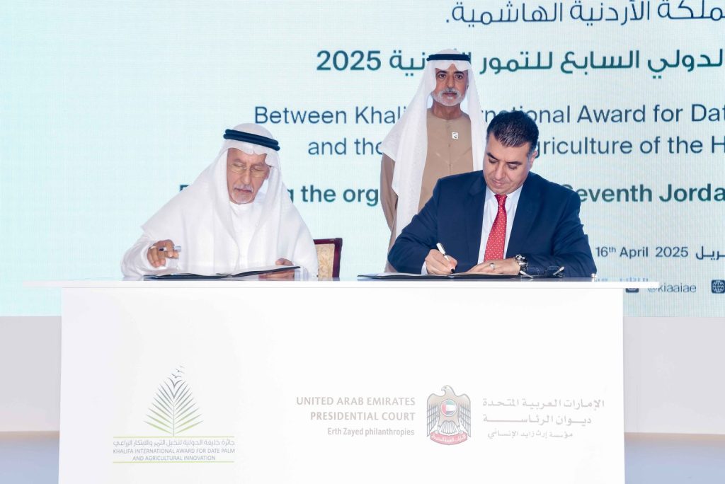 شهد معالي الشيخ نهيان بن مبارك آل نهيان وزير التسامح والتعايش، رئيس مجلس أمناء جائزة خليفة الدولية لنخيل التمر والابتكار الزراعي، توقيع مذكرة تفاهم لعام 2025 بين الأمانة العامة للجائزة مع وزارة الزراعة الاردنية وقعها معالي المهندس خالد الحنيفات وزير الزراعة وسعادة الدكتور عبدالوهاب زايد امين عام جائزة خليفة الدولية لنخيل التمر والابتكار الزراعي، في شأن تنظيم المهرجان الدولي السابع للتمور الأردنية، كما شهد توقيع 09 مذكرات تفاهم بين الجائزة وعدد من وزارات الزراعة والمنظمات الدولية…وذلك خلال حفل جائزة خليفة الدولية لنخيل التمر والابتكار الزراعي، بدورتها السابعة عشرة 2025 الذي اقيم في عاصمة دولة الإمارات العربية المتحدة ابوظبي