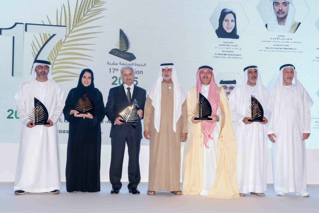 وكرم معالي الشيخ نهيان مبارك آل نهيان، الفائزين بجائزة خليفة الدولية لنخيل التمر والابتكار الزراعي بدورتها السابعة عشرة 2025 وذلك على النحو التالي: عن فئة البحوث والدراسات المتميزة والتكنولوجيا الحديثة فاز بالجائزة مناصفة بين كل من: الدكتور عبد القادر جيجلي، شركة (SuSTATability) للحلول الإحصائية من مملكة استراليا، والدكتور خالد ميشيل حزوري، مركز خليفة للتقانات الحيوية والهندسة الوراثية من دولة الإمارات العربية المتحدة، وعن فئة المشاريع التنموية والانتاجية الرائدة فاز بالجائزة مناصفة بين كل من شركة إيدن للابتكارات من دولة الإمارات العربية المتحدة، والدكتور نواف سالم الهاجري من جامعة الكويت، وعن فئة الابتكارات الرائدة والمتطورة لخدمة القطاع الزراعي فاز بالجائزة شركة سبوتّا من المملكة المتحدة، فئة المنتجون والمصنعون والمسوقون المتميزون فاز بالجائزة مناصفة بين كل من خميس محمد خميس فريح القبيسي، من دولة الإمارات العربية المتحدة، والمهندس القدري بن محمد بنعون، من الجمهورية التونسية، وعن فئة الشخصية المتميزة في مجال النخيل والتمر والابتكار الزراعي الفائزين مناصفة بين كل من الأستاذ الدكتور غلام ساروار مرخند من الجمهورية الاسلامية الباكستانية، والأستاذ الدكتور شريف فتحي علي ابراهيم الشرباصي من جمهورية مصر العربية.
