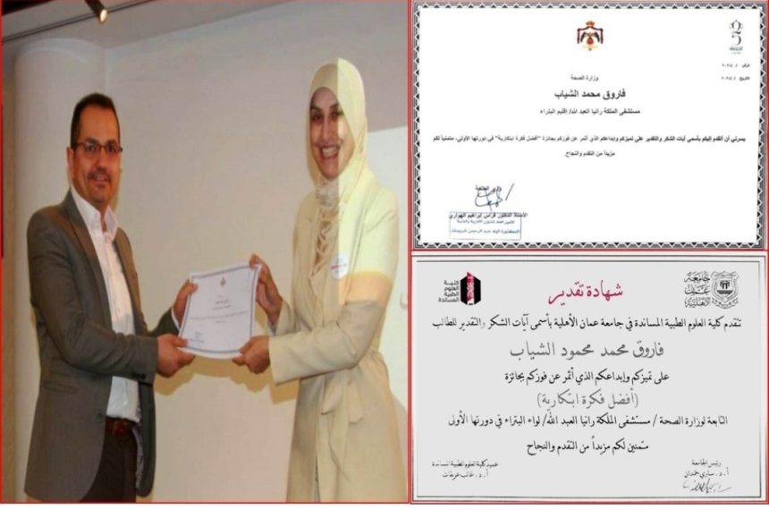 و تقديرا من الجامعة سلم الاستاذ الدكتورغالب عريقات عميد الكلية شهادة تقدير للطالب على تمييزه في هذة الفكرة الابتكارية وسيتم عرض هذه الفكرة على حاضنة الاعمال في الجامعة للعمل على تبنيها.