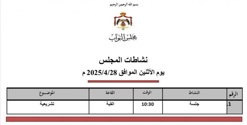 يعقد مجلس النواب جلسة تشريعية صباح الاثنين 28 نيسان 2025، في تمام الساعة العاشرة والنصف، وذلك لاستكمال مناقشة جدول أعمال الجلسة العشرين من الدورة العادية الأولى بالاضافة الى ملحق جدول الأعمال.