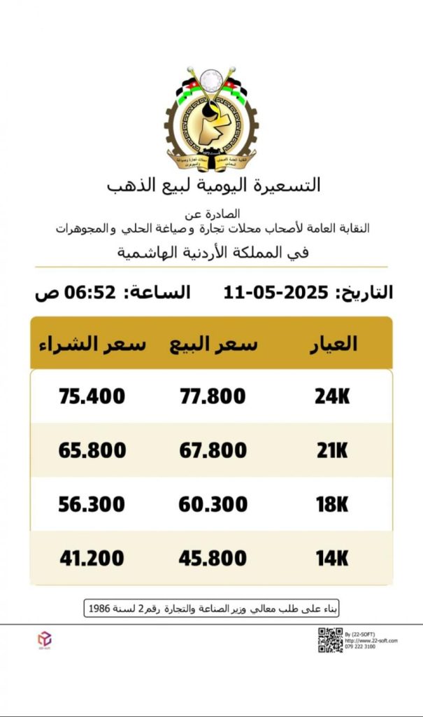 وسجّل سعر غرام الذهب من عيار 21، الأكثر طلبًا من المواطنين، 67.80 دينارًا لغايات البيع لدى محالّ الصاغة، مقابل 65.80 دينارًا لغايات الشراء.