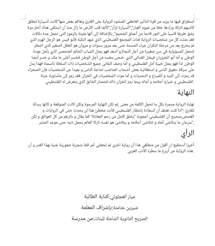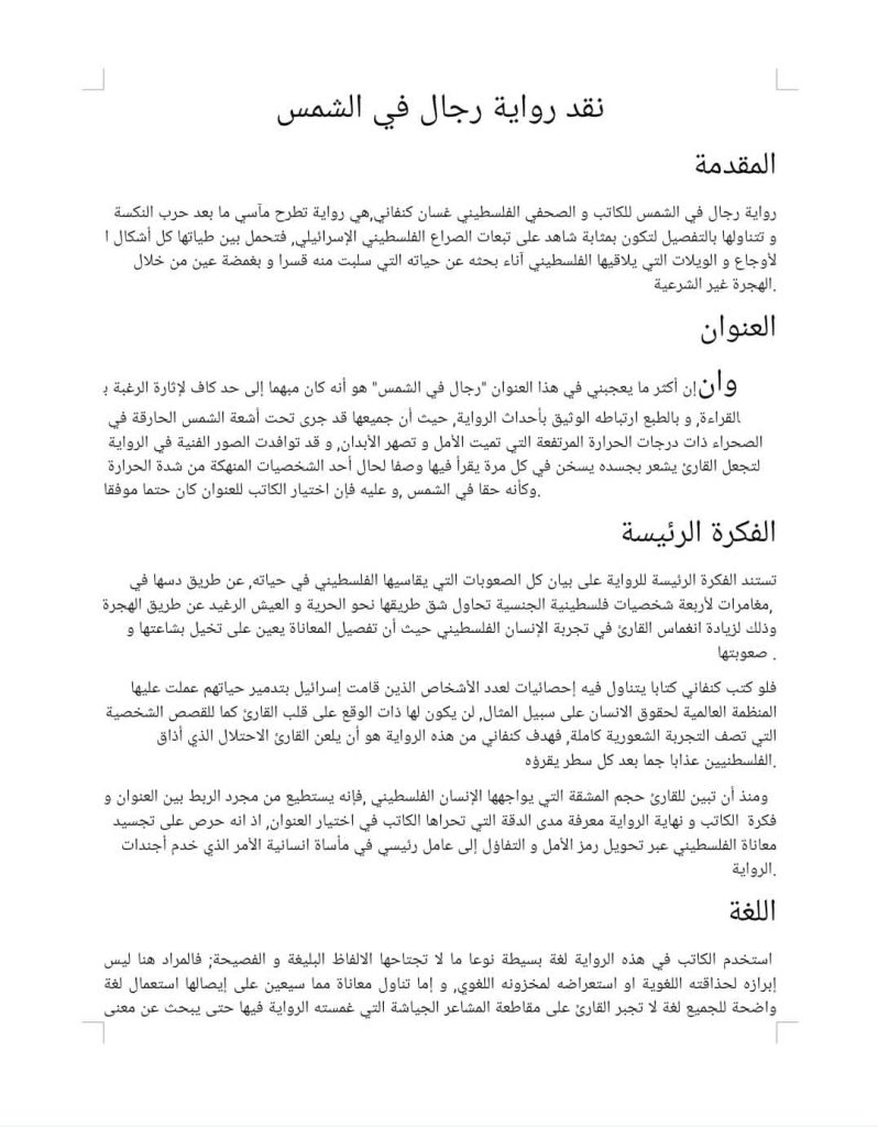برؤية طلابيّة ناقدة ،قدمت الطالبّة ميار عبدالملك العجلوني من الصّف العاشر نقدًا لرواية رجال في الشّمس.
