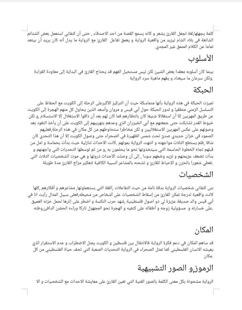 ” كنت أقوم بتحليل ما وراء كل حرف و كلمة وأتطلع لتشكيل لوحتي النقدية النهائية للرواية بشكل يسمح لقارئ المقالة معرفة مضامين الروايةوجمالياتها،و ما تؤول إليه.