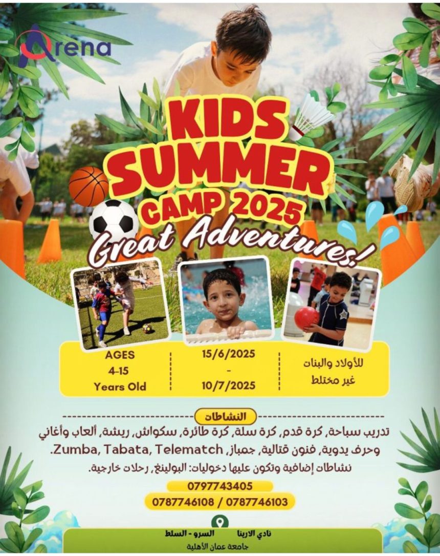 يعلن نادي الارينا في جامعة عمان الأهلية عن المعسكر الصيفي 2025 ابتداءً من 15/6/2025 لمدة شهر بواقع خمسة أيام بالأسبوع من الاحد للخميس ومن الساعة 9 صباحاً وحتى 2 ظهراَ.