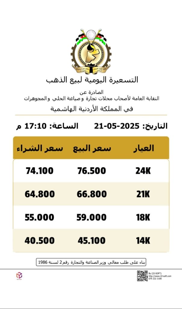 كما بلغ سعر بيع الغرام الواحد من الذهب عيارات 24 و18 و14، 76.50، 59.00، 45.10 دينارا على التوالي.