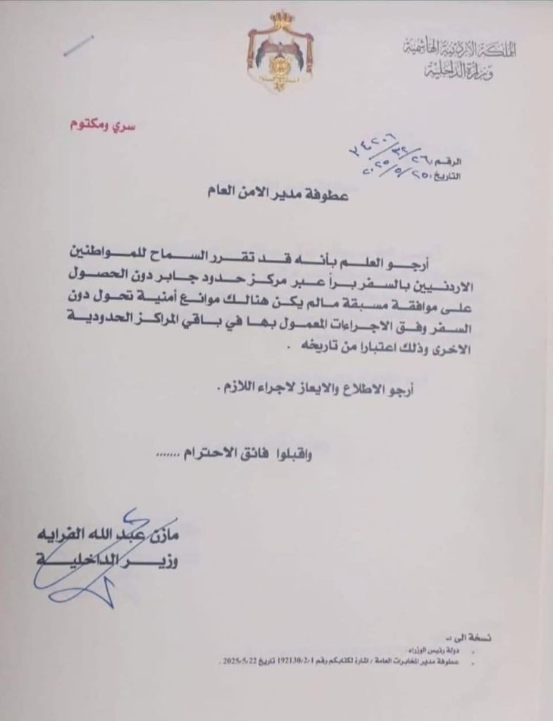 في استجابة مباشرة للمطالب النيابية، وعلى رأسها التحرك الذي قاده النائب زهير محمد الخشمان، رئيس كتلة اتحاد الأحزاب الوسطية، قرر وزير الداخلية مازن الفراية السماح للمواطنين الأردنيين بالسفر إلى الجمهورية العربية السورية عبر مركز حدود جابر دون الحاجة إلى الحصول على موافقة أمنية مسبقة، شريطة ألا تكون هناك موانع أمنية تحول دون السفر، وأن يتم تطبيق الإجراءات المتبعة كما هو معمول به في باقي المراكز الحدودية.وجاء في الكتاب الرسمي الموجه إلى مدير الأمن العام بتاريخ 2025/5/25، أن القرار يدخل حيّز التنفيذ اعتبارًا من تاريخه، وعلى الأجهزة المختصة اتخاذ ما يلزم لتنفيذه.ويُعد هذا القرار خطوة مهمة في تسهيل تنقل المواطنين وتنشيط الحركة التجارية والسياحية بين الأردن وسوريا، لا سيما قبيل حلول عيد الأضحى المبارك. ويأتي بعد مطالبات متكررة من لجنة الاقتصاد والاستثمار وعدد من النواب الذين شددوا على ضرورة رفع القيود لتيسير الحركة الحدودية وتحفيز الاقتصاد الوطني، وفي مقدمتهم النائب زهير الخشمان الذي لعب دورًا محوريًا في التنسيق والتواصل مع الجهات المعنية.