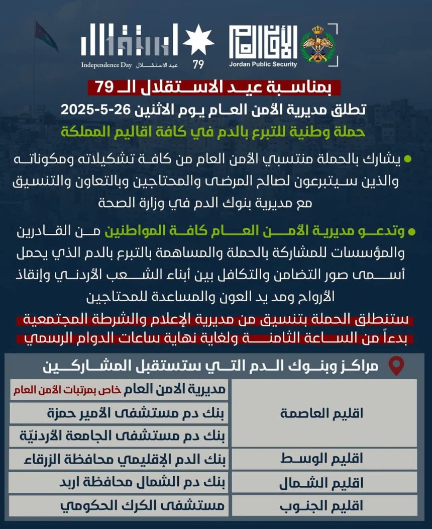 وتدعو مديرية الأمن العام، كافة المواطنين من القادرين، والمؤسسات للمشاركة بالحملة والمساهمة بالتبرع بالدم الذي يحمل أسمى صور التضامن والتكافل بين أبناء الشعب الأردني وإنقاذ الأرواح ومد يد العون والمساعدة للمحتاجين.