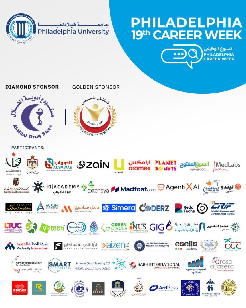 تحت رعاية معالي وزير الشباب المهندس يزن الشديفات، تنطلق يوم الأحد المقبل الموافق 2025/6/1 في جامعة فيلادلفيا، فعاليات “المسار الوظيفي” في نسختها التاسعة عشرة، بمشاركة 57 شركة محلية وإقليمية من مختلف القطاعات، بهدف توفير فرص للتشبيك، والتوظيف، والتدريب العملي لطلبة الجامعة وخريجيها مع الشركات والمؤسسات التي تبحث عن الكفاءات والمهارات.