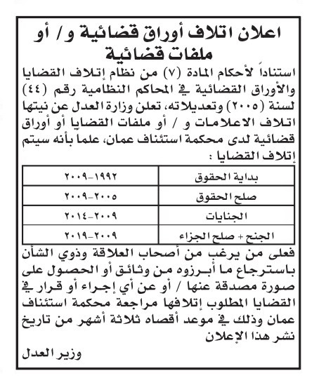 ودعت الوزارة كل من يرغب من أصحاب العلاقة وذوي الشأن باسترجاع ما أبرزوه من وثائق من وثائق أو الحصول على صورة مصدقة عنها أو عن أي إجراء أو قرار في القضايا المطلوب اتلافها مراجعة محكمة استئناف عمان في موعد أقصاه 3 أشهر.