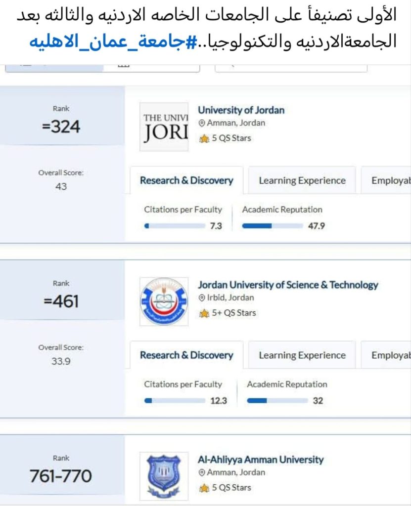 كما ان جامعة عمان الأهلية قد حضرت وبقوة في تصنيف التايمز للجامعات في دول قارة أسيا 2025 وبالمرتبة 186، ضمن قائمة ضمّت قرابة 1200 جامعة أسيوية ؛ الأمر الذي يعكس التقدم المستمر للجامعة في تعزيز مكانتها الاكاديمية والعلمية والبحثية محلياً وعربياً وقارياً وعالمياً .