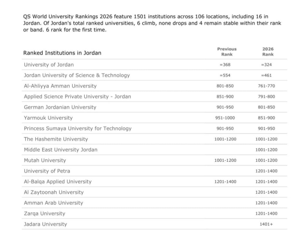 وفي هذا السياق، صرح رئيس الجامعة الأستاذ الدكتور ساري حمدان: إننا نفخر بهذا الإنجاز النوعي الذي يُضاف لسجلّ الجامعة الحافل بالانجازات، ونعتزّ بهذا الترتيب المتقدم الذي يعكس الجهود المتكاملة التي تبذلها جميع كليات ووحدات الجامعة لتحقيق هذا التميّز.