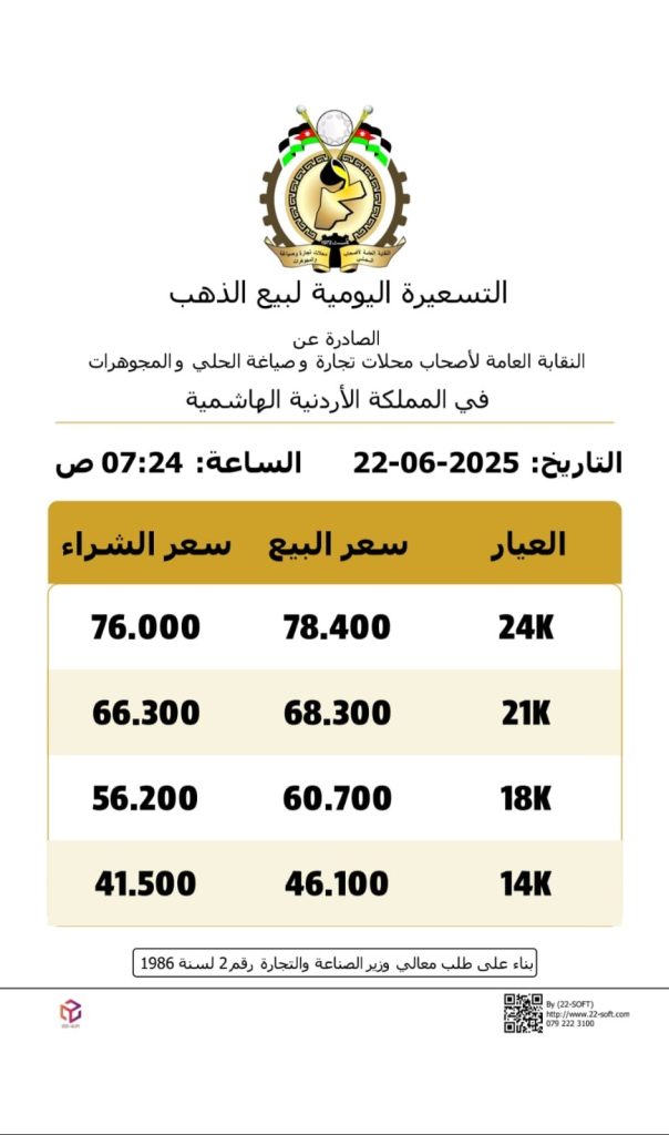وبحسب التسعيرة اليومية الصادرة عن النقابة، فقد بلغ سعر بيع الغرام من عيار 21 “الأكثر تداولاً بين المواطنين” 68.300 دينارًا وسعر الشراء 66.300 .
