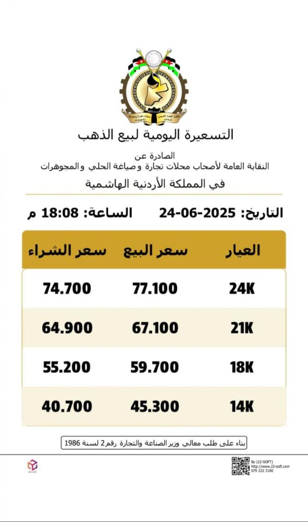 كما بلغ سعر بيع الغرام الواحد من الذهب عيارات 24 و18 و14 لغايات البيع من محال الصاغة، 77.10 و59.70 و45.30 دينارًا على التوالي.