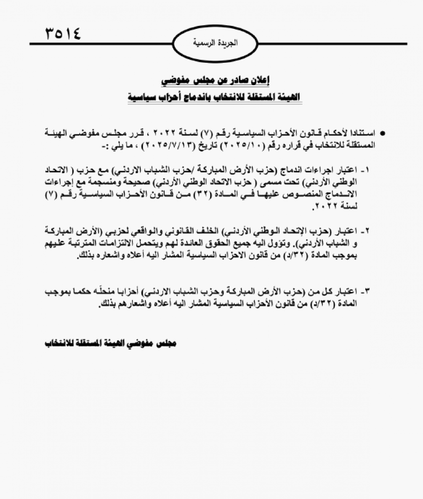 صدر في عدد الجريدة الرسمية اليوم الأربعاء، إعلان مجلس مفوضي الهيئة المستقلة للانتخابات باندماج أحزاب سياسية واعتبار إجراءات اندماج حزب الأرض المباركة وحزب الشباب الأردني مع حزب الاتحاد الوطني الأردني بموجب مسمى (حزب الاتحاد الوطني الأردني) صحيحة ومنسجمة مع الإجراءات المشتركة التي يتم تنظيمها عليها في المادة (32 ) من قانون الأحزاب السياسية.