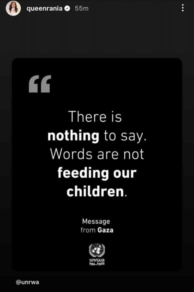 وجاء في الرسالة التي أعادت جلالتها نشرها: “لا يوجد ما يقال. الكلمات لا تطعم أطفالنا.. رسالة من غزة.”