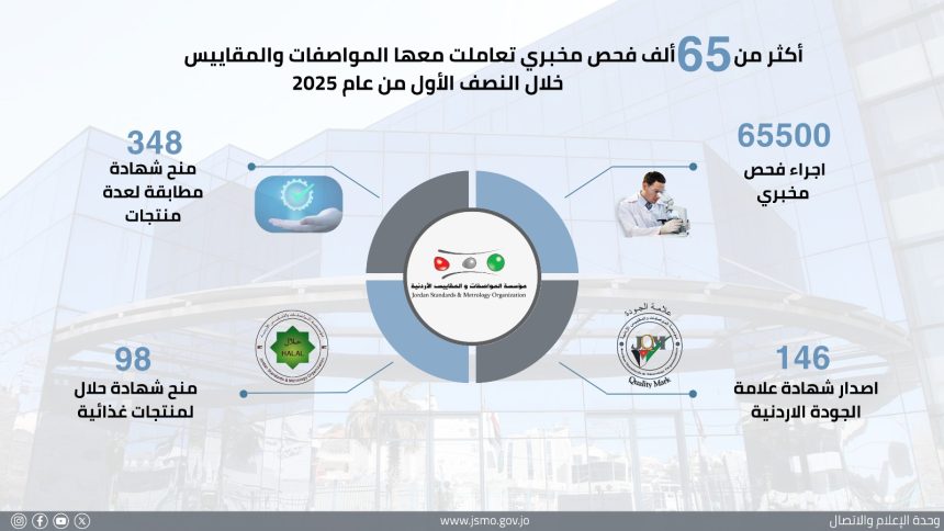 أجرت مؤسسة المواصفات والمقاييس الأردنية خلال النصف الأول من العام الحالي أكثر من (65500) فحص مخبري لعينات مختلفة، فيما أصدرت (348) شهادة مطابقة وذلك ضمن دورها الرقابي والتأهيلي لضمان جودة المنتجات في السوق المحلية وتعزيز تنافسية الصادرات الوطنية.