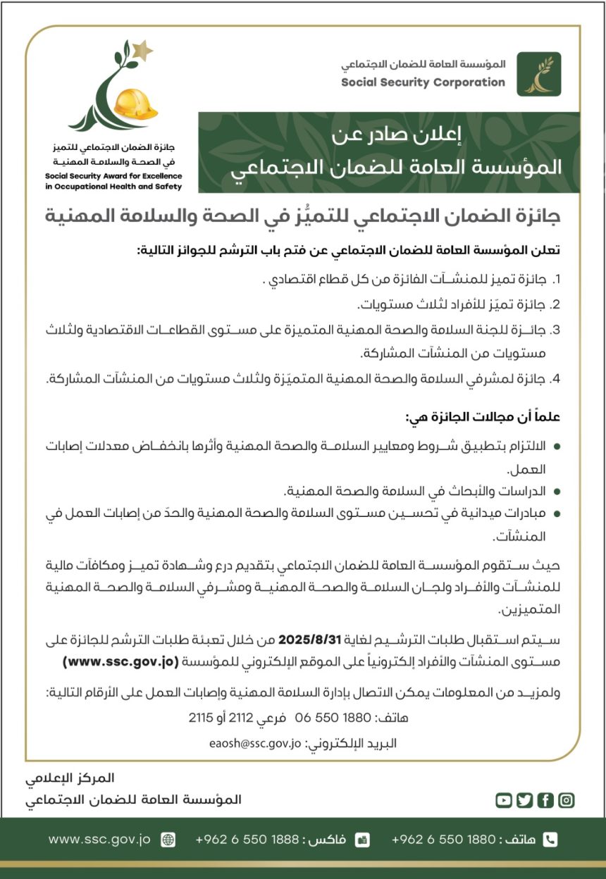 أعلنت المؤسسة العامة للضمان الاجتماعي عن تمديد استقبال طلبات الترشح لجائزة الضمان الاجتماعي للتميّز في الصحة والسلامة المهنيّة لدورة 2024/2025 على مستوى المنشآت والأفراد حتى 31/8/2025.