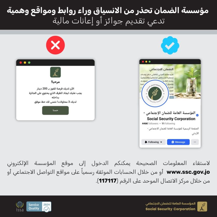 وأكدت المؤسسة على جمهورها عدم الدخول إلى الروابط المشبوهة حفاظاً على بياناتهم وخصوصياتهم المالية والشخصية، مؤكدةً على ضرورة استقاء المعلومات من قنواتها الرسمية التي توفّر من خلالها كافة المعلومات والبيانات الصادرة عنها، وذلك من خلال موقعها الإلكتروني www.ssc.gov.jo أو من خلال حساباتها الموثقة رسمياً على مواقع التواصل الاجتماعي أو من خلال مركز الاتصال الموحد على الرقم (117117) أو مركز الاتصال الوطني (065008080).