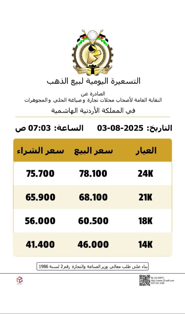 وبحسب النشرة اليومية التي أصدرتها النقابة العامة لأصحاب محلات تجارة وصياغة الحلي والمجوهرات، بلغ سعر الغرام الواحد من الذهب عيارات 24 و18 و14 لغايات البيع من محلات الصاغة عند 78.1 و60.5 و46 دينارا على التوالي.