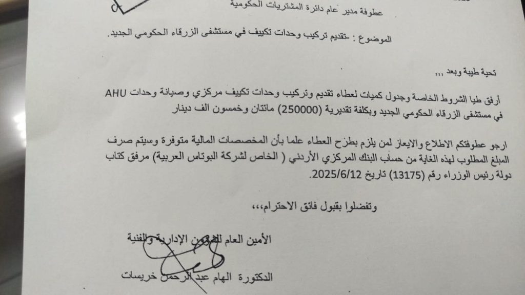 شكراً جزيلا بحجم الوطن إلى شركة البوتاس الاردنية ممثلة برئيس مجلس الادارة معالي المهندس شحادة ابو هديب والمدير العام على تبرع الشركة بمبلغ ٢٥٠ الف دينار لتركيب وحدات تكييف مركزي لمستشفى الزرقاء الحكومي .