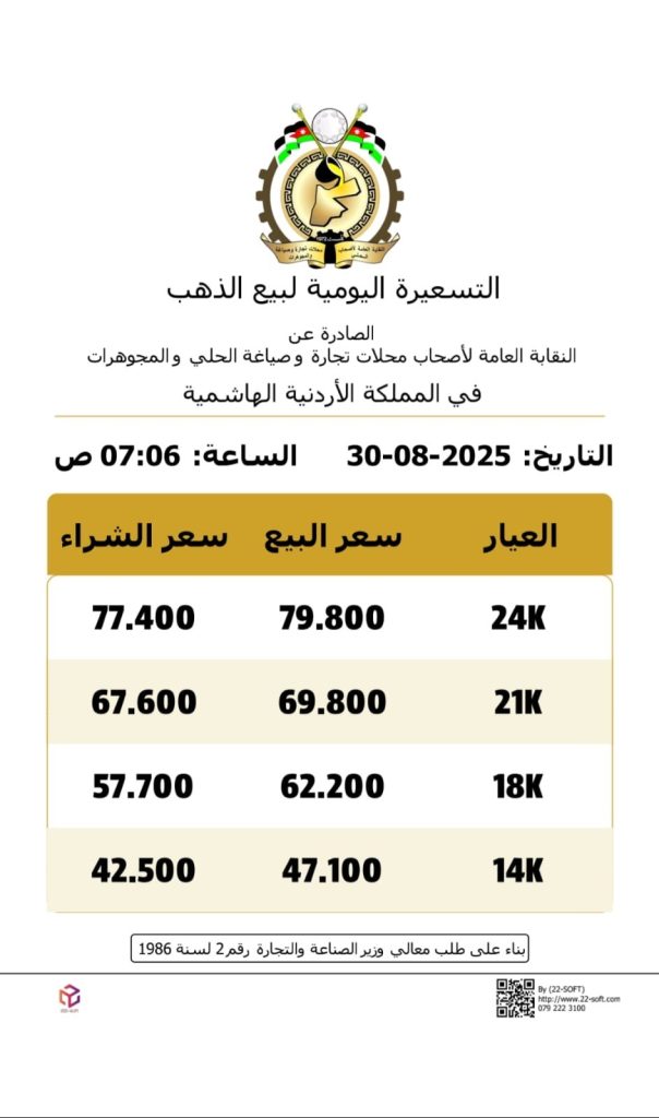 وبلغ سعر بيع غرام الذهب عيار 21، الأكثر رغبة من المواطنين 69.80 دينار لغايات البيع من محلات الصاغة، مقابل 67.60 لجهة الشراء.