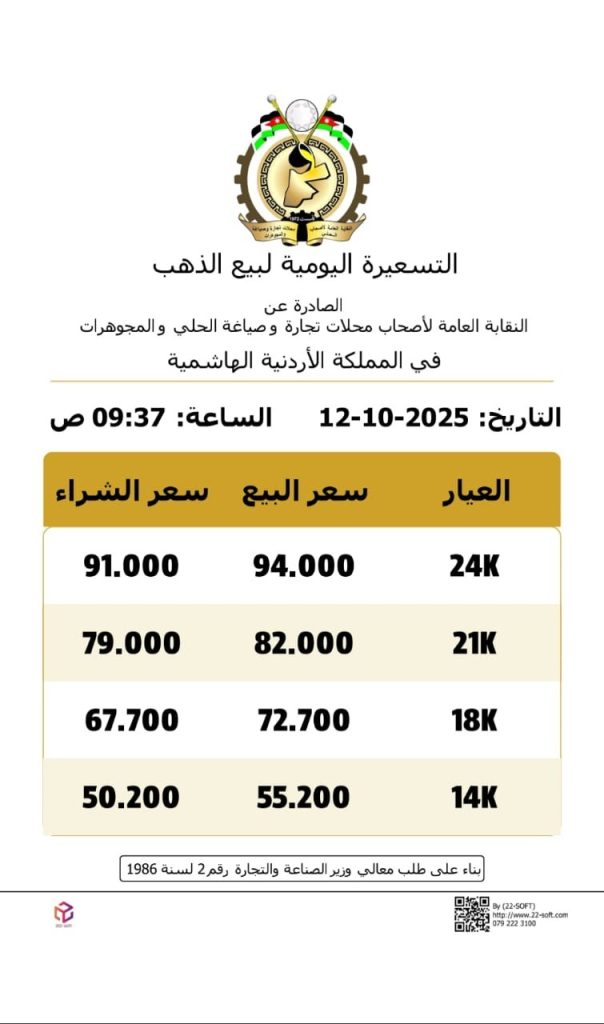 ووفقًا للنشرة اليومية الصادرة عن النقابة العامة لأصحاب محلات تجارة وصياغة الحلي والمجوهرات، سجل سعر الغرام الواحد من الذهب لعيارات 24 و18 و14 إلى 94.00 دينارًا و72.70 دينارا و55.20 دينارًا على التوالي، لغايات البيع من محلات الصياغة.