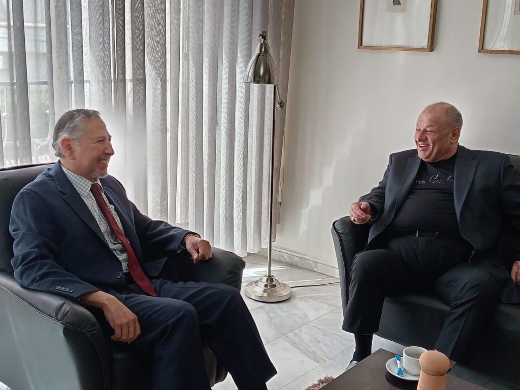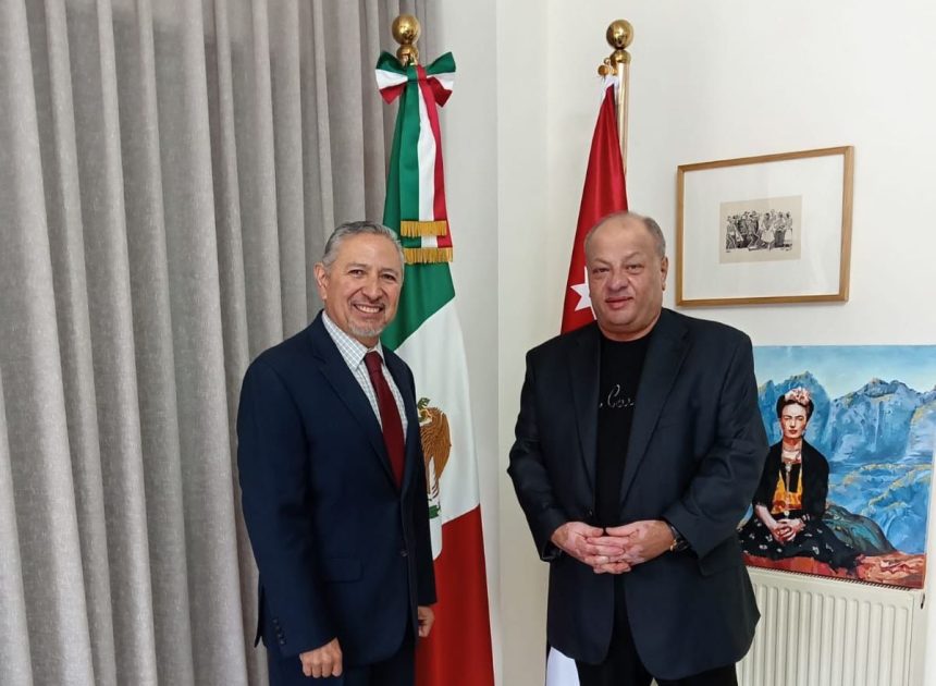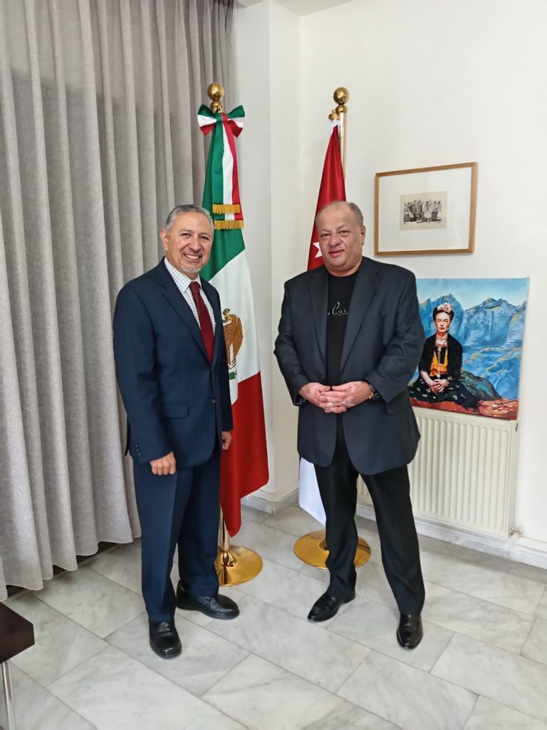 يواصل المدير التنفيذي لمهرجان جرش للثقافة والفنون ايمن سماوي بعقد اللقاءات مع السفراء المعتمدين لدى الديوان الملكي الهاشمي ، حيث التقى سماوي صباح اليوم الأحد بالسفير المكسيكي جاكوب برادو ، وجرى خلال اللقاء بحث مشاركة المكسيك في دورة المهرجان الـ 40 ، لتقديم عروض ثقافية وفلكلورية وفنية ، في إطار توطيد العلاقات الثنائية والتقارب بين الشعبين الأردني والمكسيكي .