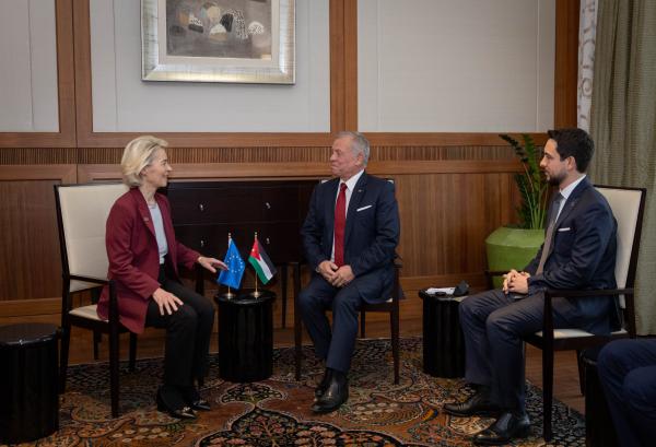 عقد جلالة الملك عبدﷲ الثاني في سلوفينيا، اليوم الاثنين، لقاءين منفصلين مع رئيسة المفوضية الأوروبية أورسولا فون دير لاين، ورئيس وزراء اليونان كيرياكوس ميتسوتاكيس، على هامش أعمال قمة دول جنوب أوروبا “ميد 9″، بحضور سمو الأمير الحسين بن عبدﷲ الثاني ولي العهد.وأكد جلالته ضرورة ضمان الالتزام باتفاق إنهاء الحرب في غزة، وتكثيف الجهود لإيصال المساعدات الإنسانية إلى جميع مناطق القطاع.وحذر جلالة الملك من خطورة استمرار الإجراءات أحادية الجانب ضد الفلسطينيين في الضفة الغربية، وخطط توسيع الاستيطان وضم الأراضي.وأشار جلالته خلال لقائه مع رئيسة المفوضية الأوروبية، إلى أهمية إدامة التنسيق مع الاتحاد الأوروبي حيال المستجدات في المنطقة، بما يخدم المصالح المشتركة ويحقق الأمن والاستقرار.وتناول اللقاء سبل توسيع التعاون بين الأردن والاتحاد الأوروبي في شتى المجالات، خصوصا إقامة المشاريع الكبرى المشتركة.ولدى لقائه رئيس وزراء اليونان، أكد جلالة الملك استمرار الأردن بدوره الديني والتاريخي في رعاية المقدسات الإسلامية والمسيحية في القدس، انطلاقا من الوصاية الهاشمية عليها.
